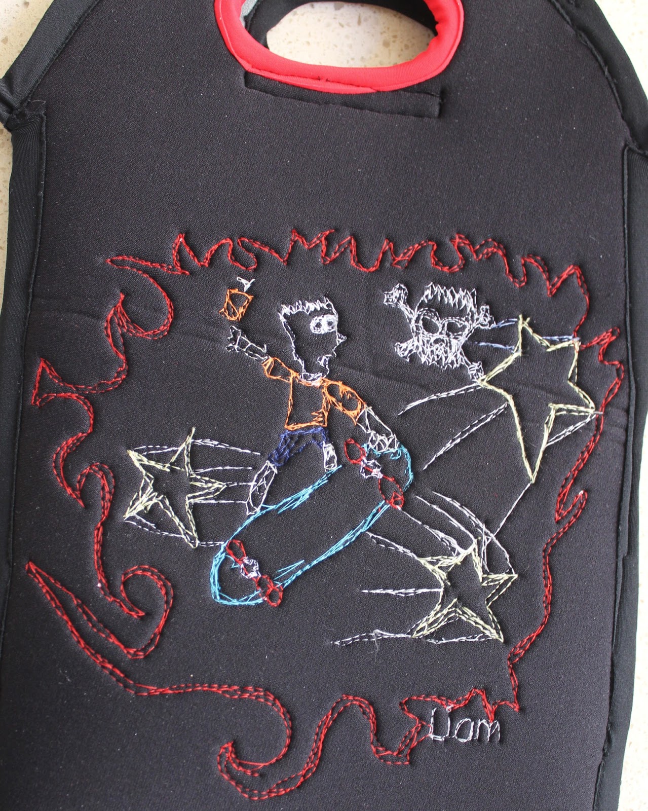 While I was doing that, my son used a heart template to trace and cut out the small hearts from red sticky paper. The larger heart was traced on the computer screen from one we found on the internet. The paper wasn't sticking strongly enough to the fabric so I stitched around each one to hold it in place. The sides of the tunic were held together with a small line of stitching.
